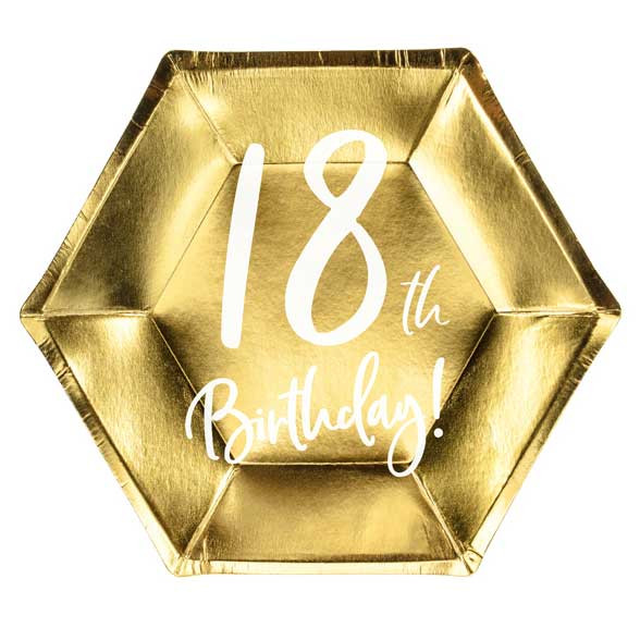 Sexkantiga papperstallrikar i guld från PartyDeco är det perfekta valet för att fira en 18-års fest. Med sex stycken tallrikar i varje förpackning är de perfekta för att servera mat och tårta på den speciella dagen.