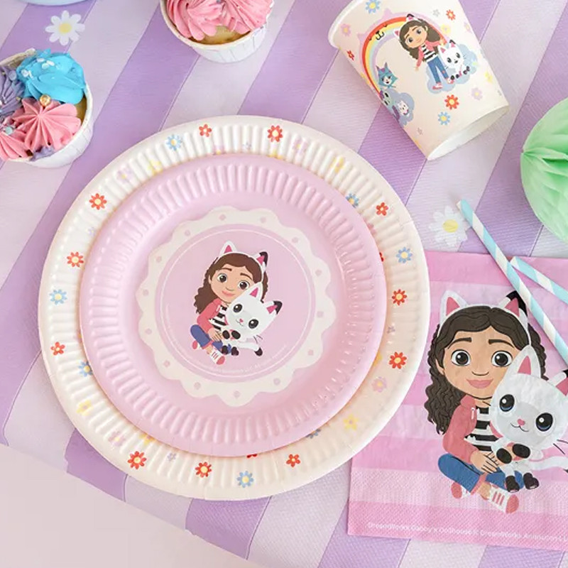 Dessa söta och färgglada papperstallrikar med motiv från Gabby och hennes kattkompis kommer att göra kalasdukningen extra rolig för barnen! Den mindre storleken (18 cm) passar perfekt för tårta, frukt eller snacks på kalaset. Med ett 6-pack av tallrikar i olika färger och motiv från Gabby’s värld kan du skapa ett komplett och lekfullt tema genom att matcha dem med muggar, servetter och dukar från samma serie.
