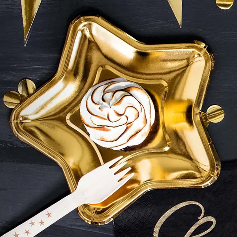 Dessa glänsande stjärnformade papperstallrikar i guld är perfekta för att lyfta din festdukning till nästa nivå. Oavsett om det är nyårsfesten, studentfirandet eller barnkalaset, kommer dessa tallrikar att få varje detalj att stråla lite extra. Den unika stjärnformen gör dem inte bara dekorativa utan också praktiska och passar perfekt för allt från tårtservering till snacks.