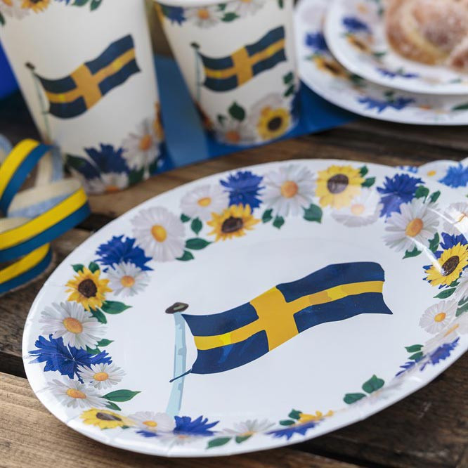 Dessa fina vita papperstallrikar är de perfekta tillbehören för festliga tillfällen som midsommar, studentfiranden, nationaldagen och sommarkalas. Med en vackert designad svenska flaggan och blommor i gult, blått och vitt är de både dekorativa och praktiska.