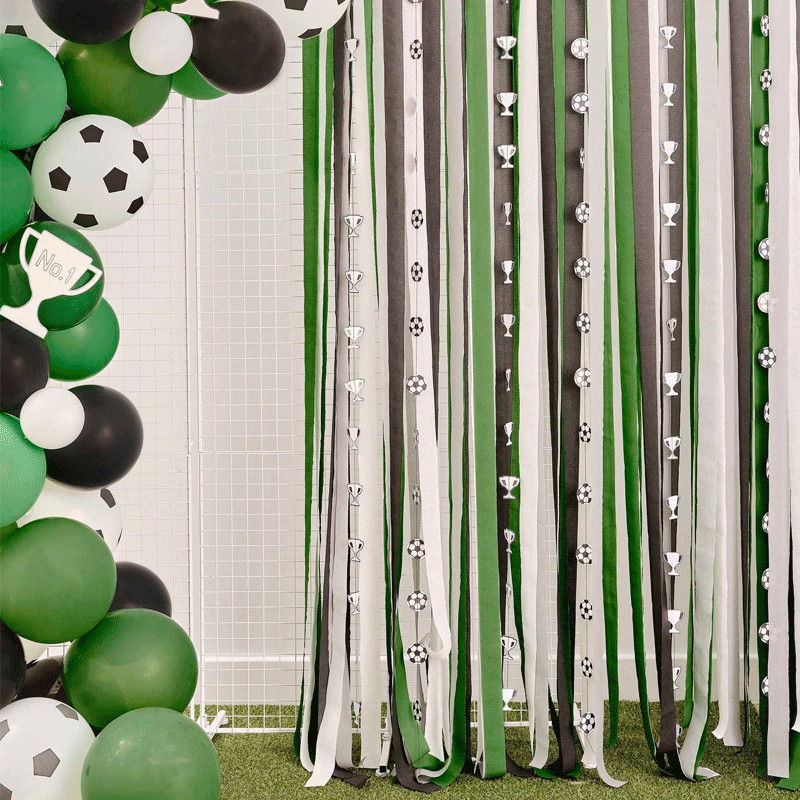 Dekorera fotbolls-kalaset med detta snygga draperi i svart, vitt och grönt med fotbollsdetaljer på. Skapa ett effektfullt uttryck med denna dekorativa produkt.