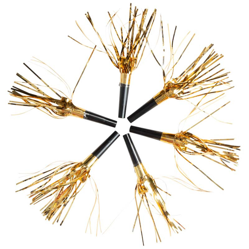 Skapa en härlig feststämning med dessa partytutor i glansig guld. Designade för att höja festkänslan, tutar och fladdrar de när man blåser i dem och är perfekta för alla typer av firanden, särskilt för att fira in det nya året eller studentfesten.