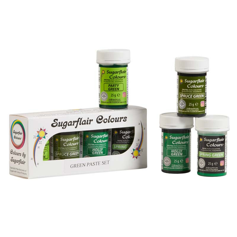 Denna gröna färguppsättning från Sugarflair ger dig möjligheten att skapa allt från ljusa vårgröna nyanser till djupa skogsgröna toner. Med fyra högkoncentrerade färger i setet kan du enkelt blanda dem för att uppnå den perfekta nyansen på dina bakverk. Färgerna passar bra till en rad olika livsmedel som sockerpasta, marsipan, smörkräm och gum paste.
