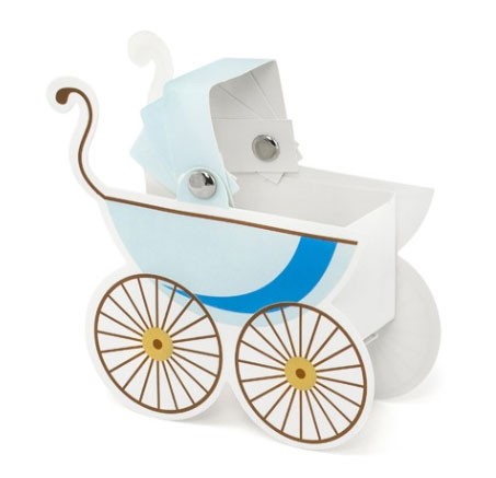 Presentaskar i form av blåa barnvagnar som passar perfekt för att fylla med godis eller små presenter. Dessa söta presentaskar är ett charmigt tillägg till dukningen på dopet eller babyshowern.