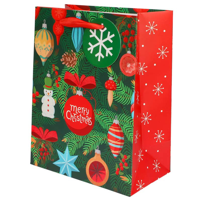 Denna vackra presentpåse är perfekt för att ge bort julklappar under säsongen. Med motiv av julgransdekorationer och Merry Christmas i vitglittrig text blir varje present extra festlig. De röda, gröna mönstren ger påsen en traditionell julig känsla. På den sidenliknande handtaget finns en liten etikett där du kan skriva en personlig julhälsning. Den perfekta touchen för att göra varje gåva ännu mer speciell.