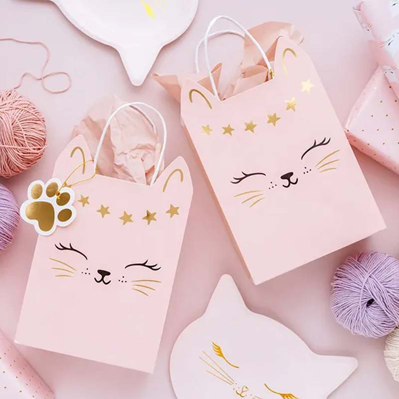 Denna gulliga presentpåse i form av ett katthuvud är perfekt för att göra presenten extra speciell. Med mjuka färgtoner och lekfulla detaljer passar den utmärkt för barnkalas, temakalas eller till kattälskaren. En personlig touch ges med den praktiska handtagen och den tassformade gift taggen där du kan skriva en hälsning. Tillverkad av FSC-märkt papper för hållbarhet och enkel transport. Antal: 1 styck. Storlek: 18 x 10,5 x 27,5 cm. Färg: rosa med gulddetaljer.
