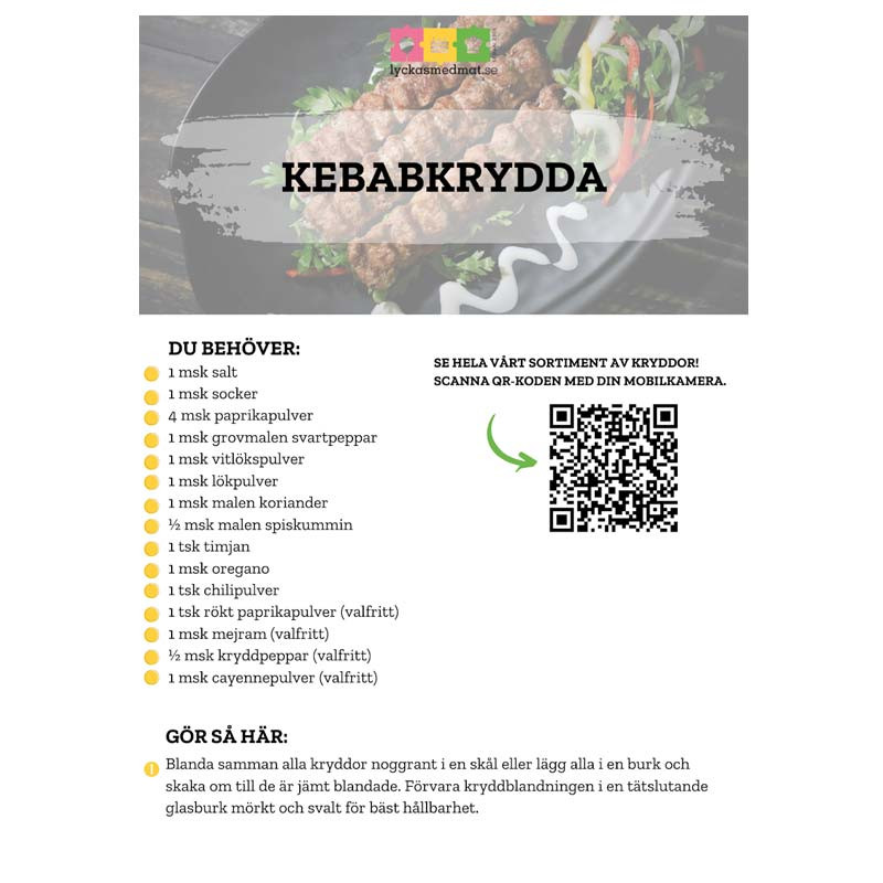 Skapa autentiska smakupplevelser hemma med din egenblandade kebabkrydda. Förutom sin smak är kryddan lätt att anpassa efter eget tycke, och passar i både kött och vegetariska rätter. Enkla ingredienser och steg-för-steg-instruktioner levereras på ett stadigt receptkort i A6-format.