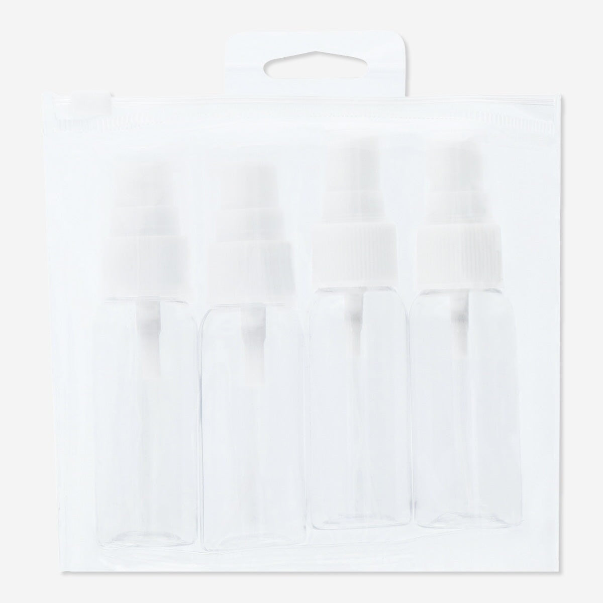 Detta 4-delade reseset innehåller transparenta sprayflaskor som rymmer 30 ml, alla bekvämt förvarade i en transparent väska med måtten 14 x 15,8 x 3,7 cm. Den genomskinliga kroppen hjälper dig att snabbt identifiera innehållet, vilket gör den idealisk för att förvara dina vätskor på ett organiserat sätt. Perfekt för sprit och sprayer på språng, detta set är en resevänlig lösning för dina toalettbehov.