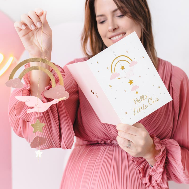 Det här dubbelvikta kortet i rosa är perfekt för dop eller baby shower! Med texten ”Hello little one!” på framsidan förmedlar det en söt hälsning. En hängande dekoration med en stork, regnbåge, moln och stjärnor följer med för att skapa en fantastisk atmosfär. Ett rosa kuvert med guldkanter gör det till en fin gåva.