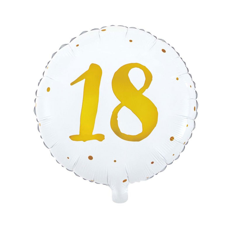 Den runda folieballongen är perfekt för att fira 18-åringen! Med en diameter på 46 cm och en elegant design med vita och guldiga prickar samt siffran 18, är det den optimala ballongen för 18-års festen. Ballongen kan fyllas med antingen luft eller helium.