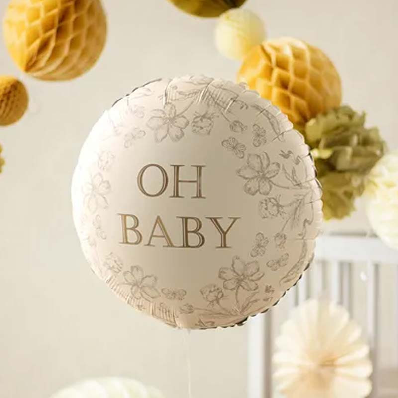 Denna stilrena folieballong i rund form är ett perfekt tillskott till din babyshower. Med en beige bakgrund och guldig text ”Oh Baby” tillsammans med blommönster i mjuka toner, blir den här ballongen en minnesvärd detalj. Passande för gender reveals, dop eller babyshowers.