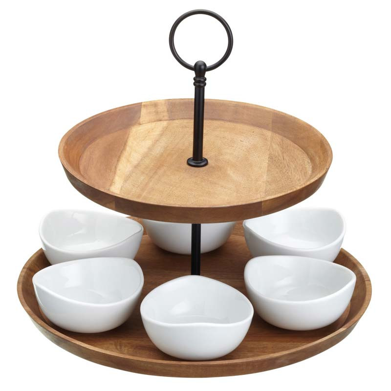 Denna snygga serveringsfat med två våningar i acaciaträ kommer komplett med 6 vita porslinsskålar. Perfekt för att servera aptitretare, tapas eller ostbrickor på ett stilrent sätt! Det svarta handtaget i fatets mitt gör det enkelt för gästerna att skicka runt fatet mellan varandra.
