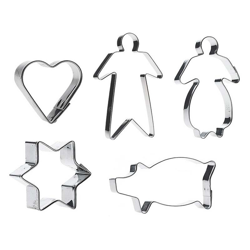 Detta set med fem olika pepparkaksformar är perfekt för dig som älskar att baka under julen eller andra festliga tillfällen. Med former som hjärta, stjärna, gris, gubbe och gumma kommer ditt pepparkaksbak att bli både roligt och kreativt!