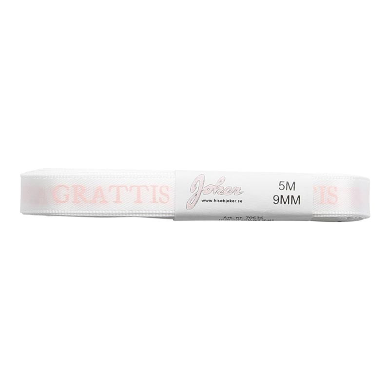 Det här vackra sidanbandet i vitt med texten ”grattis” i rosa är en perfekt detalj för att dekorera blommor, presentförpackningar eller tårtor när du vill fira någon speciell. Bandet är 5 meter långt och 9 mm brett, vilket ger dig tillräckligt med längd för att skapa vackra dekorationer.