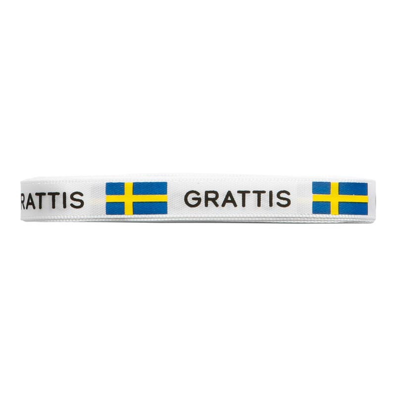 Dekorera din tårta eller present med detta vackra sidenband i vitt med texten grattis och Sveriges flagga. Bandet är 5 meter långt och 9 mm brett, perfekt för att fira olika tillfällen som studenten eller nationaldagen.