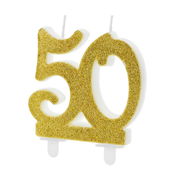 Dekorera tårtan för 50-åringen med detta snygga sifferljus i guldglitter från PartyDeco. Det är en praktisk lösning för att fira 50-årsdagen utan att använda massor av vanliga tårtljus.