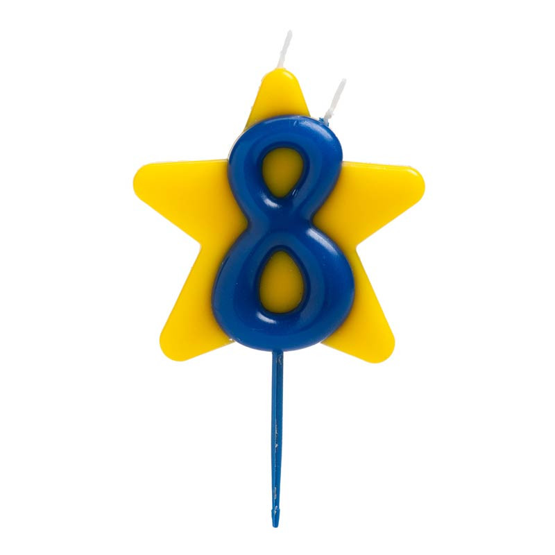 Dekorera din födelsedagstårta med detta söta sifferljus med nummer 8 och stjärna i gul och blå färg. Med två vekar för extra effekt och en pinne för säker placering på tårtan blir det enkelt att skapa ett minnesvärt ögonblick.