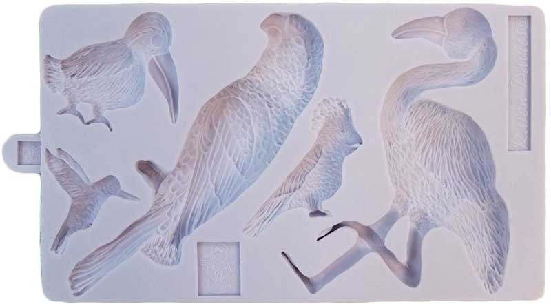 Skapa vackra fåglar från tropikerna med denna rejäla silikonform från Karen Davies. Formen är perfekt för att skapa flamingos, papegojor, kolibrier, kakaduor och tukaner till dina bakverk. Passar utmärkt för sommarfester, bröllop och andra tillställningar med tropiskt tema. Texturen är detaljrik och motiven är både vackra i sig själva och perfekta för att dekoreras som realistiska fåglar.