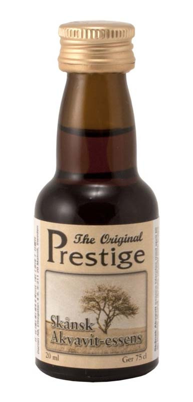 Skånsk akvavit drinkessens från Prestige är en essens som blandas med okryddat brännvin för att skapa en klassisk akvavit. Denna essens är perfekt att njuta av väl kyld som snaps till mat, särskilt till sill eller kräftor. En flaska räcker till 75 cl brännvin och det har aldrig varit enklare att smaksätta din sprit själv. Innehållet på 20 ml ger 75 cl skånsk akvavit. Förberedning är enkel, häll bara flaskans innehåll i en 75 cl flaska med 1-2 sockerbitar, fyll upp till 3/4 med sprit och skaka tills sockret löst upp sig. Serveras väl kyld.