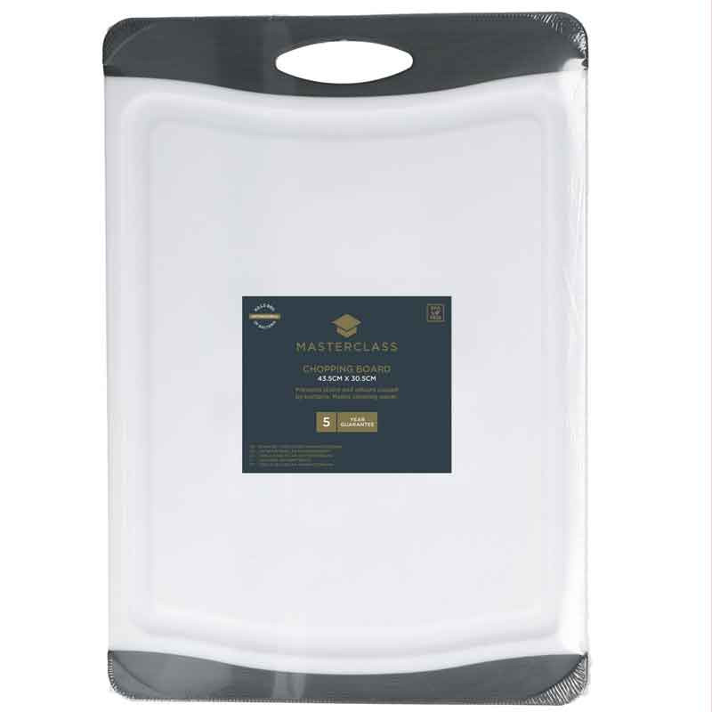 Denna hygieniska skärbräda från Masterclass är tillverkad av livsmedelsgodkänd polyeten och termoplastiskt gummi. Den har en giftfri yta som minskar bakterietillväxten med 99,9% och minimerar skador på köksknivar. Skärbrädan är dubbelsidig med ett smart handtag och en skåra längs kanten för enkel hantering och tömning av vätskor. Den halkfria ytan säkerställer stabilitet på köksbänken eller andra ytor.