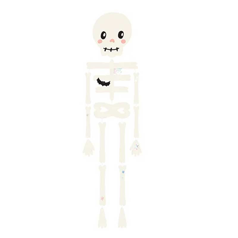 Skapa en riktigt kuslig stämning med detta hängande skelett från PartyDeco. Figuren mäter ca 110 cm och kan hängas i taket, vid entrén eller på väggar för att överraska gästerna. Perfekt för Halloweenfester, spökkalas och temadukningar. Skelettet består av 15 delar som träs på tillhörande snöre.