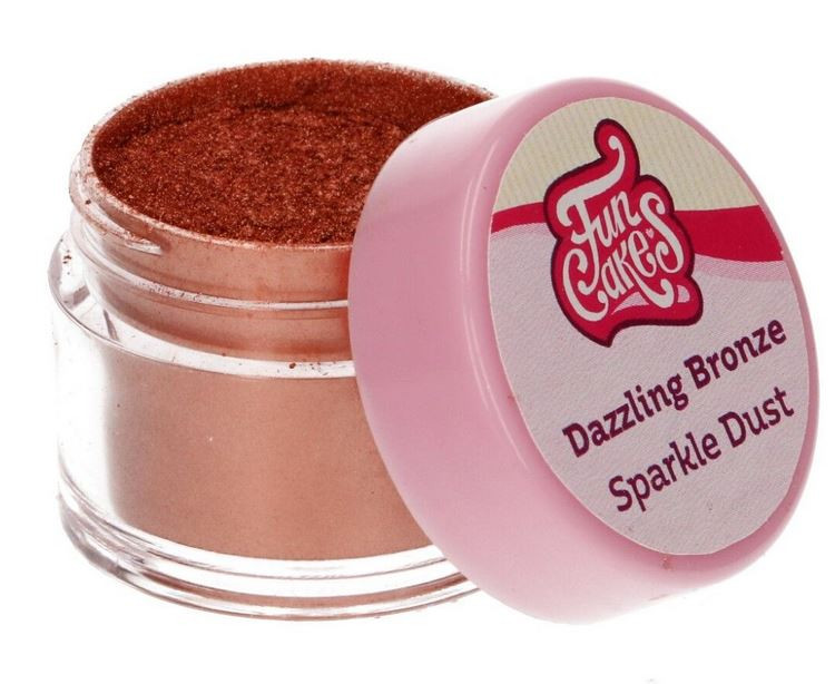 Ge dina bakverk och tårtdekorationer en snygg skimrande finish med FunCakes ätbara skimrande färg i pulverform. Du borstar helt enkelt på pulvret på t.ex. sockerpasta, marsipan eller gum paste med hjälp av en pensel. Perfekt till att dekorera tårtor, figurer och sockerblommor! Du kan även blanda pulvret med ofärgad alkohol för att få en flytande färg att måla med. Innehåll: 1,5 g Färg: Brons Skimrande 100% ätbar Lätt att använda Förvaring: 15°C-22°C, förvara på en mörk plats
