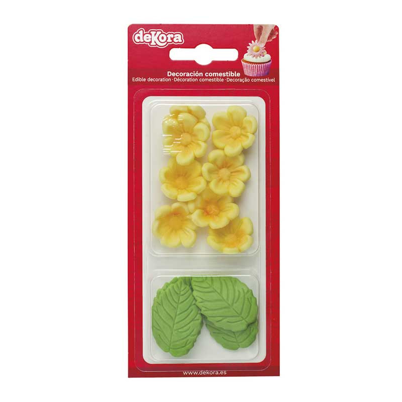 Skapa vackra bakverk med dessa ätbara sockerdekorationer i form av gula blommor och gröna blad. Perfekt för att dekorera tårtor, cupcakes och andra bakverk med en touch av elegans.