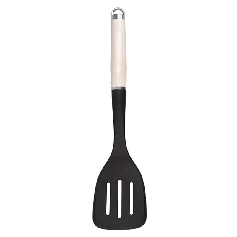 Denna stekspade från KitchenAid är tillverkad av nylon med ergonomiskt handtag i färgen Almond Cream. Den är designad för att ge bättre kontroll när du lyfter och vänder mat. Nylonmaterialet är fläck- och luktbeständigt och skadar inte non-stickbelagda ytor. Spaden är reptålig, värmetålig och har hål för att fettet ska stanna kvar. Med en upphängningsögla för smidig förvaring är denna stekspade ett praktiskt köksredskap.