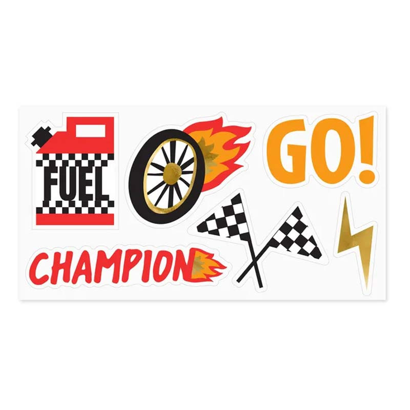 - Innehåller motiv som flaggor, däck, eldflammor och texter som ”GO!” och ”CHAMPION”