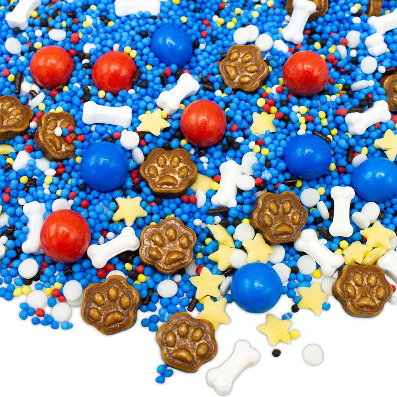 Paw Power strössel från Happy Sprinkles är en färgsprakande mix fylld av tassavtryck, ben, stjärnor, chokladkulor och färgglada nonpareils. Denna unika blandning passar perfekt till barnkalas, cupcakes, tårtor och donuts, och är ett självklart val för alla hundälskare eller de som vill skapa ett lekfullt tema.