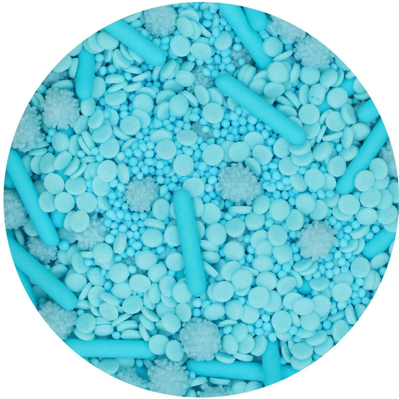 Strössel ljusblå Medley från FunCakes är en vacker blandning av olika strösselvariationer, perfekt för att dekorera kakor och glass. Med blandningen av sockerfigurer, pärlor, mimosor, konfetti, sockersträngar och nonpareils i en ljusblå färg, är denna mix idealisk för babyshower, gender reveal och vinter-bakelser.