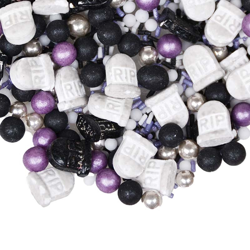 Den spöklikt vackra strösselblandningen från SweetKitchen kommer i en mix av lila, silver, svart och vitt. Innehållet består av små 3D-gravstenar med texten ”R.I.P”, tillsammans med pärlor och strössel i olika former och nyanser. Perfekt för att skapa en dramatisk effekt på cupcakes, tårtor, kakor och desserter.
