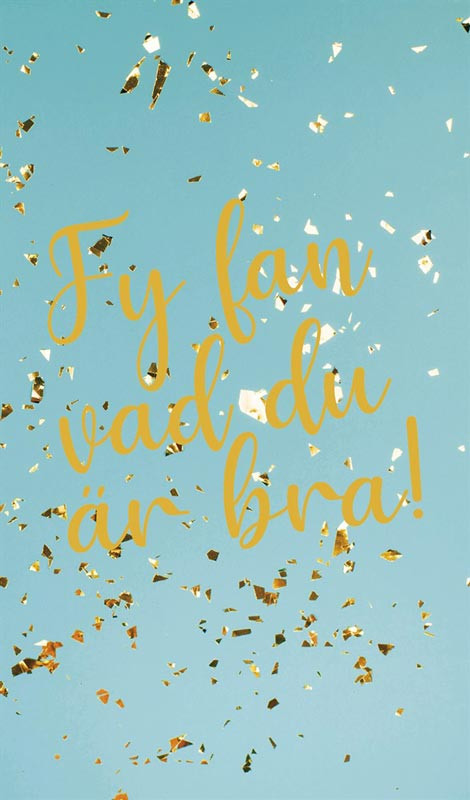 Det här studentkortet är perfekt för att skicka ett uppmuntrande meddelande till en vän eller familjemedlem. Med konfetti och texten ”Fy fan vad du är bra!” är det en rolig och positiv överraskning att få. Det blanka insidan ger dig möjlighet att skriva en personlig hälsning och kuvertet ingår för enkel förvaring eller leverans.