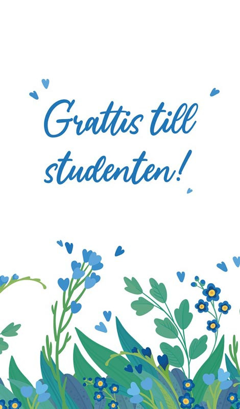 Detta vackra studentkort är perfekt för att fira en student med dess eleganta design av blomstermotiv i blått och en hjärtlig hälsning ”Grattis till studenten!”.