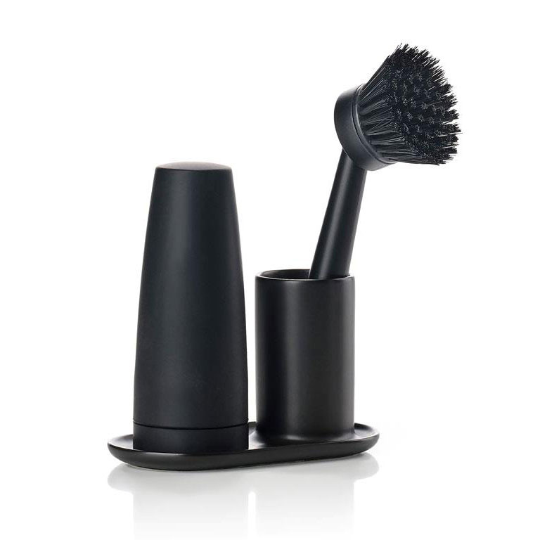 Det svarta disksetet från Zone Denmark har en stilren och enkel design som passar perfekt in i det moderna köket. Diskborstens huvud går att enkelt byta ut och den keramiska hållaren tål diskmaskin vilket gör den både praktisk och snygg. Med pumpflaskan kan du dosera tvål eller diskmedel med ett lätt tryck. Ett perfekt sätt att hålla diskbänken organiserad och snygg.