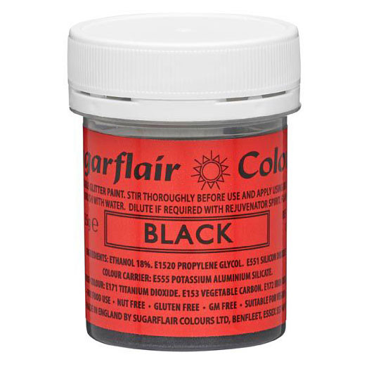 Denna svarta glitterfärg från Sugarflair är perfekt för att färga sockerpasta eller marsipan och skapa fantastiska tårtdekorationer och unika konstverk. Applicera färgen enkelt med en pensel på ditt bakverk. Om färgen är för tjock kan du blanda i lite rejuvenator spirit för att justera konsistensen. Penseln rengörs enkelt med vatten efter användning. Förvara produkten på en torr plats och undvik direkt kontakt med lågor på grund av dess brandfarliga egenskaper.
