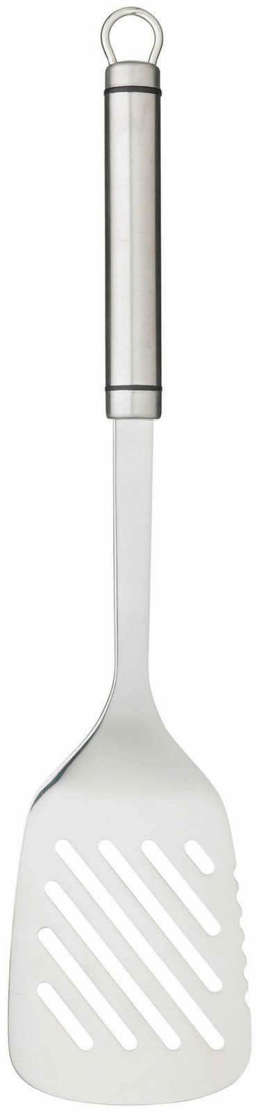 Denna stekspade i rostfritt stål har perforerade hål och en tandad sida för enkel hantering av maten. Den har ett bekvämt ovalt handtag med en praktisk upphängningsögla. Tack vare dess konstruktion tål den maskindisk och har en total längd på 36 cm med en spade som mäter 10 x 8 cm.