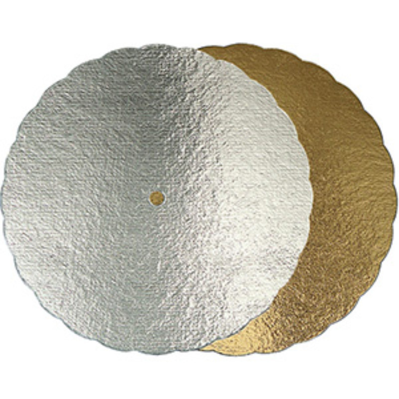 Denna dekorativa tårtbricka för tårtställning erbjuder både en silver- och guldsida för olika serveringstillfällen. Med ett utstansat hål i mitten kan den användas praktiskt till tårtställning, men kan också användas som en vanlig tårtbricka. Tillverkad i pressad papp med en dekorativ volangkant, gör den perfekt för att lyfta fram dina tårtor på ett elegant sätt.