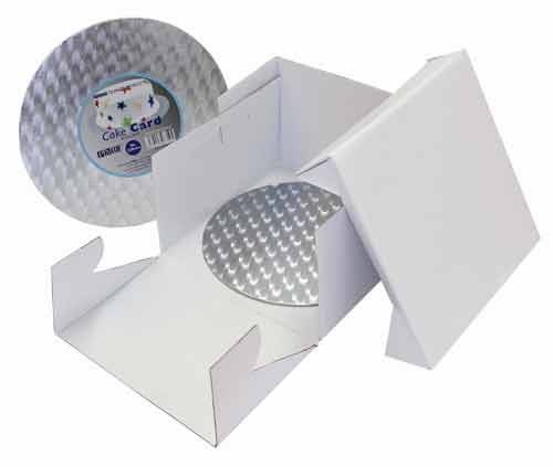 Denna tårtkartong från PME levereras med en rund tårtbricka, perfekt för transport och uppackning av tårtan. Tårtbrickan är 3 mm tjock och belagd med silverfärgad, mönstrad folie. Varje förpackning innehåller en kartong och en bricka, med en storlek på 30,5 x 15 cm.