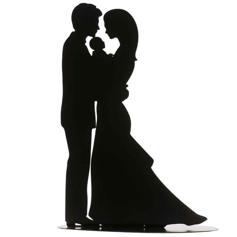 Dekorera bröllopstårtan med detta charmiga brudpar bestående av en kvinna, en man och en bebis. Med en höjd på 18 cm är denna dekoration tillverkad i svart metall och kommer med en platta i genomskinlig plast för enkel placering på tårtan.