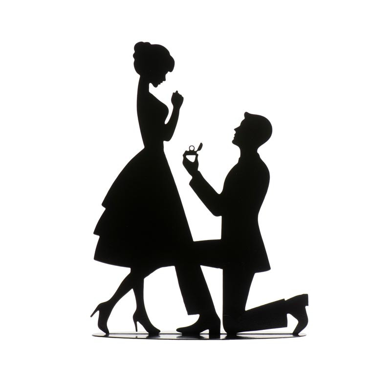 Dekorera bröllopstårtan med ett vackert kärlekspar i metall som visar en man och en kvinna i friarstämning. Denna dekoration är 18 cm hög och tillverkad i svart metall. Den levereras med en genomskinlig plastplatta som gör det enkelt att placera dekorationen på tårtan.