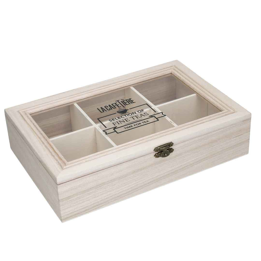 Denna vackra telåda från La Cafetière är tillverkad i obehandlat trä och erbjuder sex rymliga fack för att organisera dina olika tesorter. Med sin naturliga och tidlösa design är telådan perfekt för både köket och servering av afternoon tea, samtidigt som den fungerar som en elegant inredningsdetalj som förhöjer din dukning.