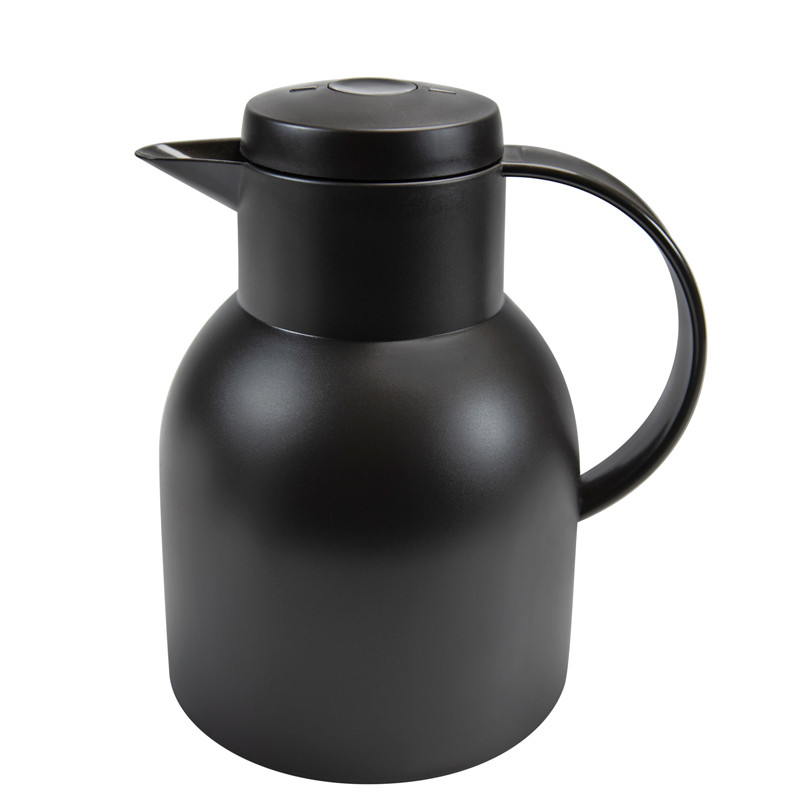 Denna behändiga svarta termoskanna med glasinsats är perfekt för att hålla värmen på din favoritdryck! Med en diameter på 14,5 cm och en höjd på ca 21,8 cm rymmer den en liter kaffe, varm choklad eller annan varm dryck. Endast handdisk rekommenderas för denna termoskanna.