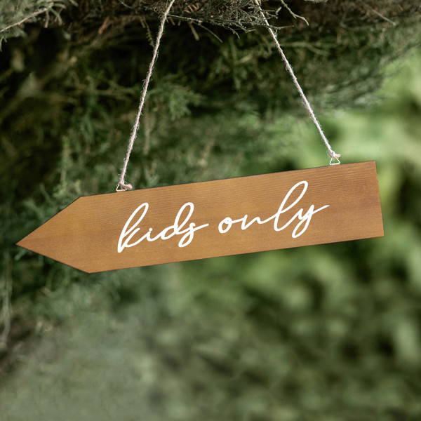 Träskylt med texten ”kids only”. Skylten är formad som en pil i ena änden och texten står på båda sidor av skylten. Du kan därför enkelt hänga upp skylten åt det håll som passar bäst. Den här snygga skylten i mörkare trä är fin att ha upphängd på till exempel bröllop för att visa vägen till barnens egna lilla del. Den är även utmärkt till barnkalas eller andra tillställningar. Skylten kan också hängas upp utanför barnens rum som en rolig detalj i inredningen. Storlek: 36 x 7,5 cm Snörets längd: ca 60 cm Till bröllop, event, jubileum & fest