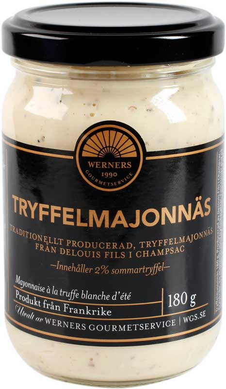 Tryffelmajonnäs från Werners Gourmetservice är en lyxig majonnäs tillverkad på traditionellt sätt med äggula, vinäger, dijonsenap, solrosolja och salt. Den är smaksatt med vit Albatryffelolja och bitar av sommartryffel, vilket ger en rik och intensiv tryffelsmak. Denna delikatess är perfekt för att förhöja smaken på grillade hamburgare, ugnsrostade rotsaker eller en saftig köttbit. Tryffelmajonnäsen är även en utmärkt present till finsmakaren.
