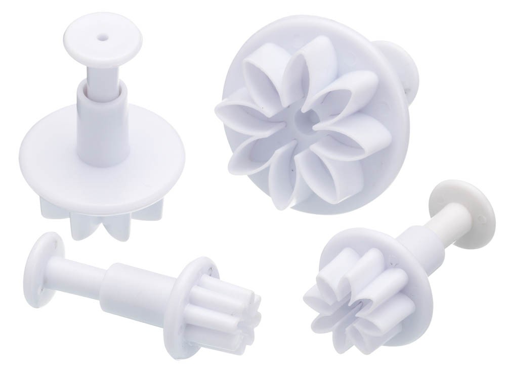 Denna praktiska uppsättning med fyra utstickare i olika storlekar från Kitchen Craft gör det enkelt att skapa vackra blommor av marsipan, gum paste, sockerpasta eller kakdeg. Varje utstickare har en ejektorfunktion för att smidigt lossa blomman. Med storlekarna 3,5 cm, 2,7 cm, 1,9 cm och 1,3 cm kan du skapa blommor i olika storlekar för olika dekorationer.