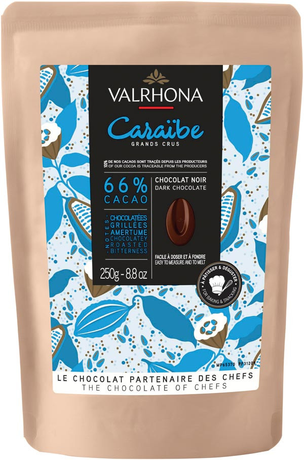 Valrhonas Caraibe är en mörk choklad med en kakaohalt på 66%. Kakaobönorna är en mix av bönor från den karibiska övärlden. Chokladsmaken är mild, välbalanserad och rund och har toner av russin, vanilj och rostade hasselnötter. Caraibe är den perfekta chokladen för pralintillverkning eller som topping. Förvaras torrt, mörkt och svalt.