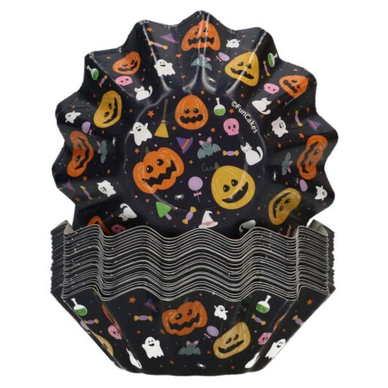 Du kan skapa unika cupcakes och muffins till Halloween med dessa veckade muffinsformar från FunCakes. Tillverkade i extra tjockt och fettresistent papper som gör att de står stadigt av sig själva, behöver du ingen muffinsplåt. Formarna har en dekorativ veckad design och är prydda med färgglada Halloweenmotiv som pumpor, spöken och fladdermöss. Perfekta till både cupcakes, muffins, brownies och andra godsaker som blir ett blickfång på gottebordet. Antal: 48 stycken. Storlek: Ø8 cm. Höjd: 3,5 cm. Tål temperatur upp till 220°C.