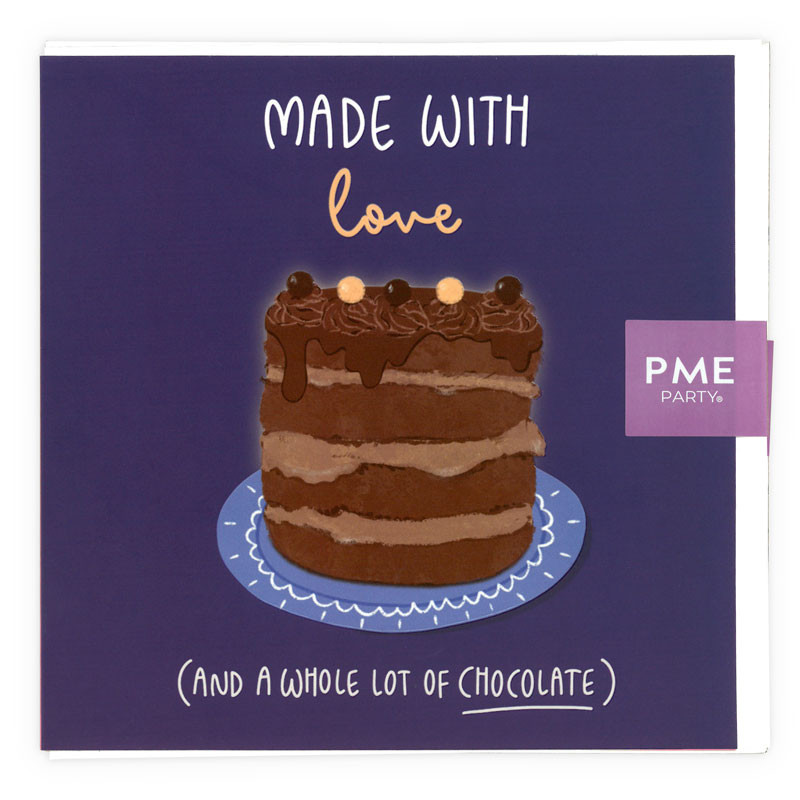 Detta charmiga gratulationskort – ”Made with love (and a whole lot of chocolate)” – är perfekt för att pigga upp någons fest eller speciella dag. Med mycket tomt utrymme inuti kortet finns det gott om plats att skriva en personlig hälsning och göra ögonblicket mer minnesvärt. Lägg till en söt, känslosam touch till din väns speciella dag med detta vikta kort med ljus och färgglad design.
