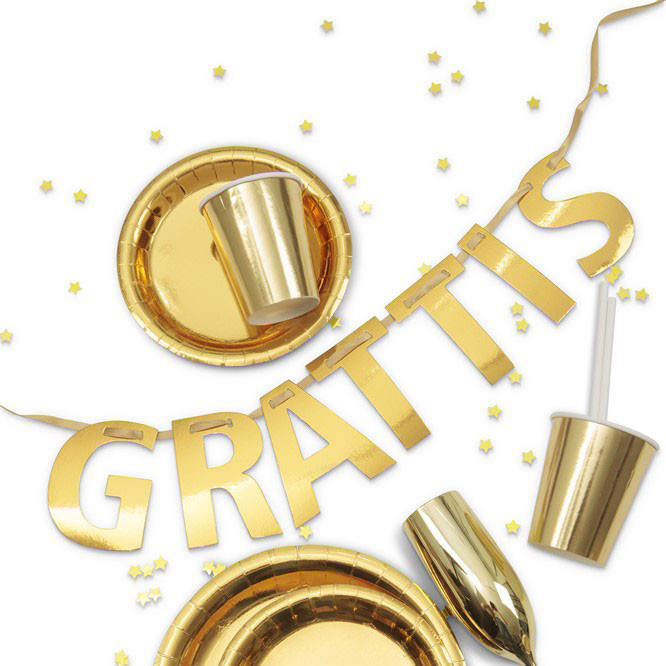 Den gyllene vimpeln med texten ”Grattis” är perfekt för att förena festyran vid födelsedagsfirandet. Med en längd på 2 meter och en höjd på 10 cm är den idealisk för att hänga mot en vägg, i trädgården eller över bordet. Framsidan är glänsande i guldfärg medan baksidan är vit, vilket ger en elegant touch till dekorationen. Tillverkad av FSC-papper, är denna vimpel både hållbar och stilfull.